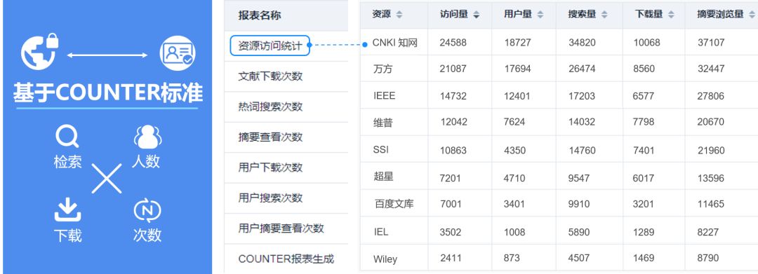 本系統(tǒng)按照COUNTER國(guó)際標(biāo)準(zhǔn)對(duì)用戶(hù)數(shù)據(jù)進(jìn)行統(tǒng)計(jì)分析,內(nèi)置多個(gè)電子資源統(tǒng)計(jì)模板,可精確統(tǒng)計(jì)用戶(hù)電子資源檢索及下載。