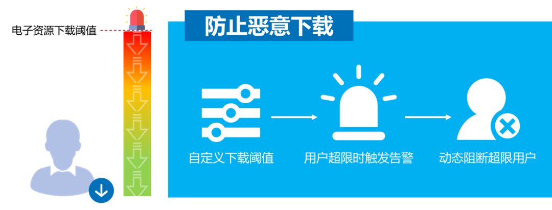 本系統(tǒng)支持自定義用戶(hù)電子資源下載閾值,當(dāng)用戶(hù)超限時(shí)觸發(fā)告警,通知管理員的同時(shí)自動(dòng)阻斷該用戶(hù)繼續(xù)訪問(wèn)。本系統(tǒng)也支持自定義超限用戶(hù)禁止訪問(wèn)的時(shí)長(zhǎng)。