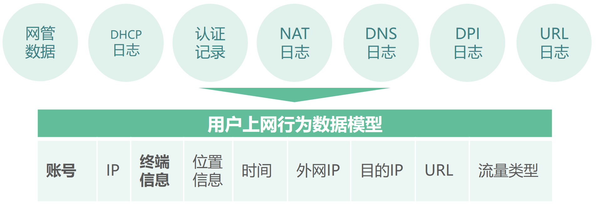 用戶進行網(wǎng)絡訪問的過程中會產生各類數(shù)據(jù),包括網(wǎng)管數(shù)據(jù)、DHCP 數(shù)據(jù)、DNS 數(shù)據(jù)、認證數(shù)據(jù)、NAT數(shù)據(jù)、URL 數(shù)據(jù)和DPI 數(shù)據(jù)等。但高校的IT 管理及支撐類系統(tǒng)數(shù)據(jù)管理性差,導致部分數(shù)據(jù)缺失;并且各系統(tǒng)數(shù)據(jù)分散存儲,無法統(tǒng)一管理;同時各類數(shù)據(jù)間缺乏關聯(lián),查找困難;因此目前高校難以實現(xiàn)統(tǒng)一的用戶網(wǎng)絡行為數(shù)據(jù)分析。
